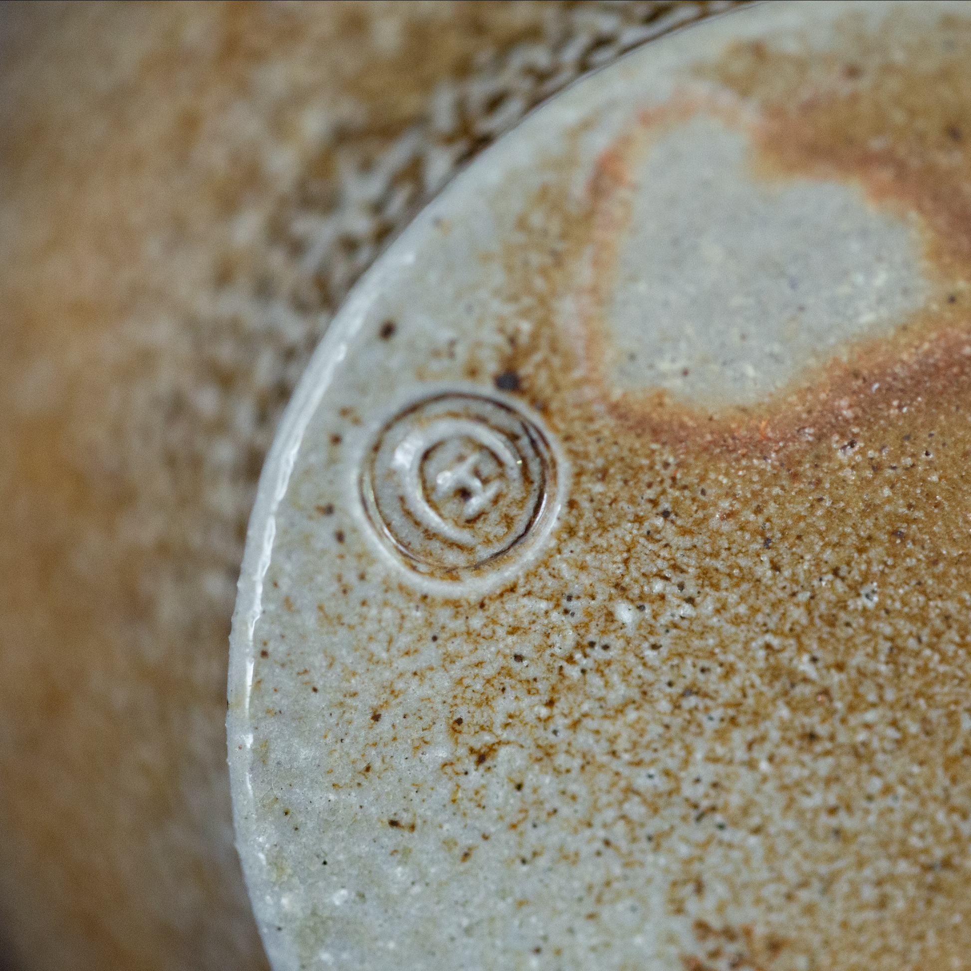 A beautifully made wood fired salt glazed modern take on a 17th century bottle. The typical Bellarmine face recreated as a stylised sun on an otherwise undecorated bottle - the stunning glaze on show.